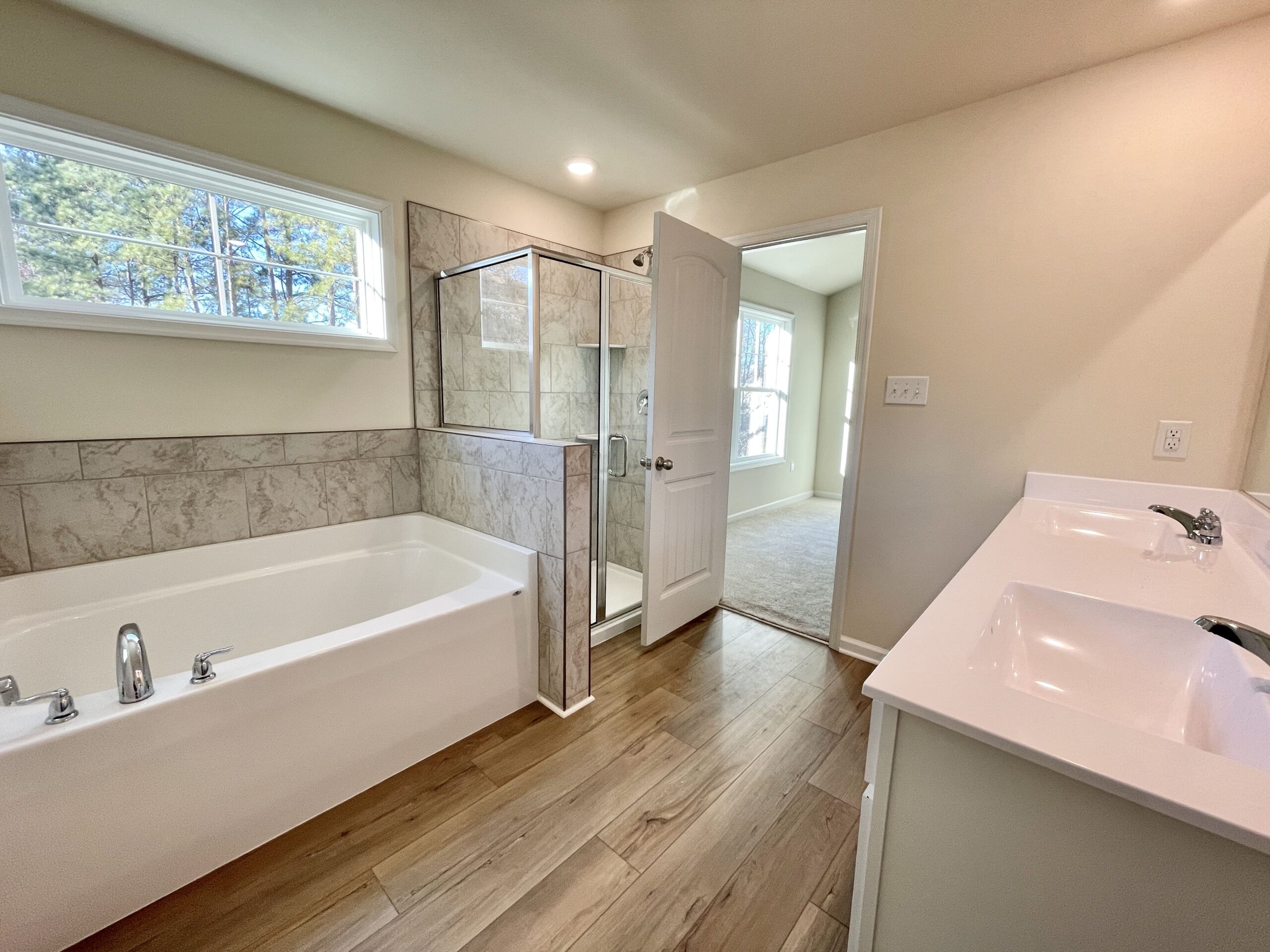 - En Suite Bathroom Soaking Tub and Tile Shower with Glass Enclosure
