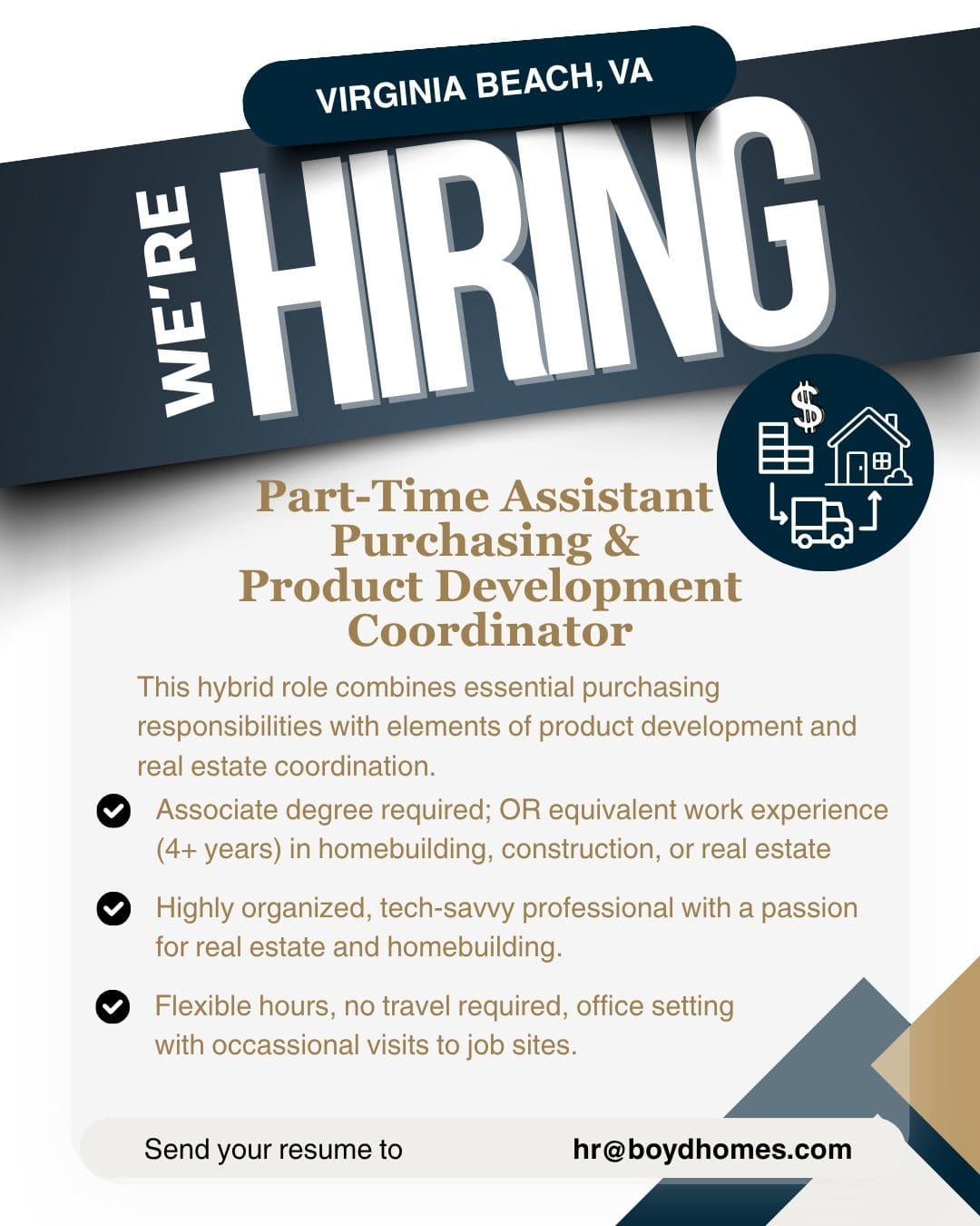 We’re seeking a detail-oriented and motivated Assistant Purchasing & Product Development Coordinator (Part-Time) to support the Single-Family division. This hybrid role combines essential purchasing responsibilities with elements of product development and real estate coordination. The ideal candidate is a highly organized, tech-savvy professional with a passion for real estate, homebuilding, and cross-functional collaboration.