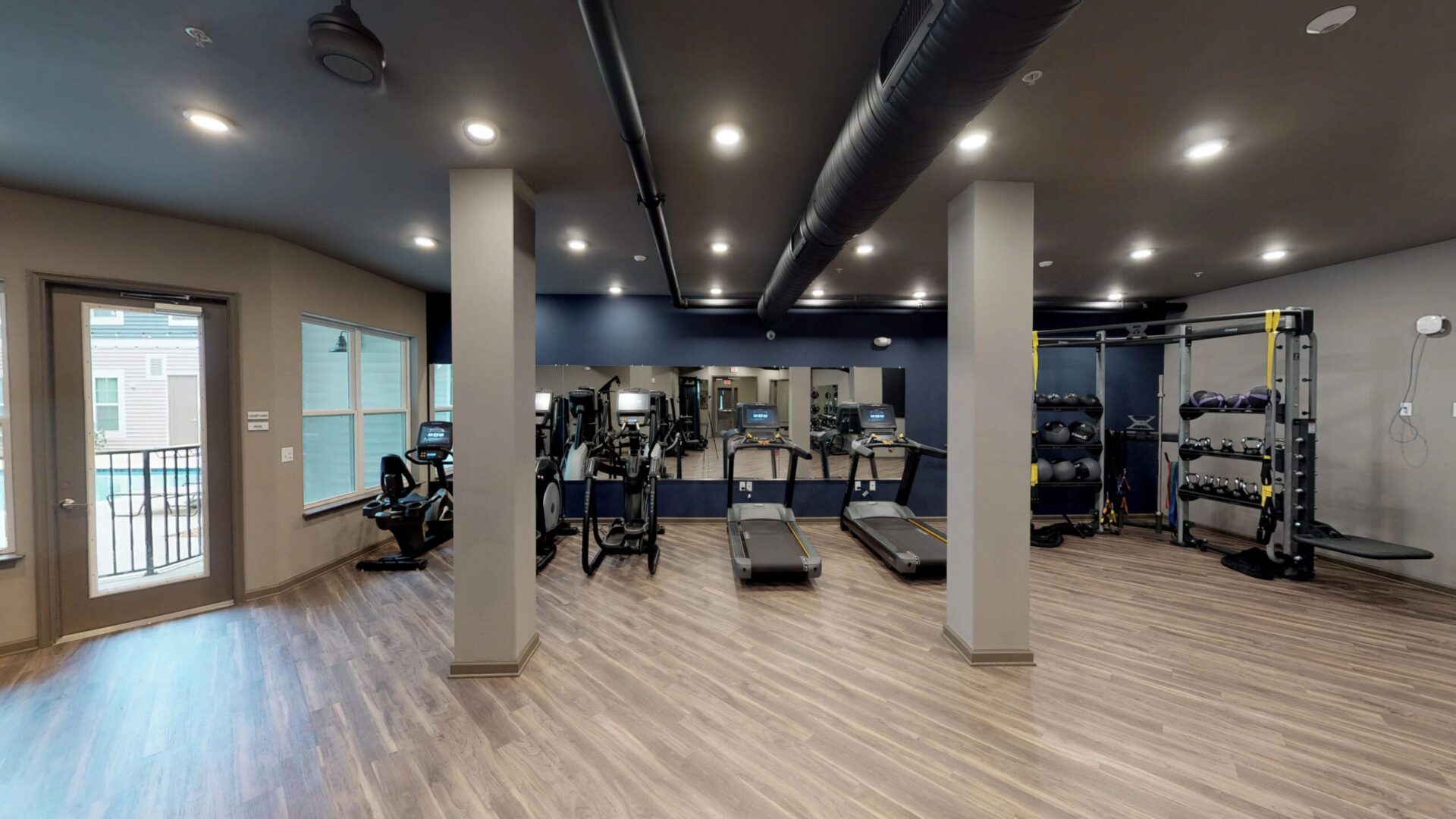The Fitness Center saves you money on a gym membership! There’s plenty of room to do aerobics, plyometrics, pilates, kettlebells, and TRX exercises. There’s a whole row of cardio machines, strength training machines and equipment, and virtual fitness.